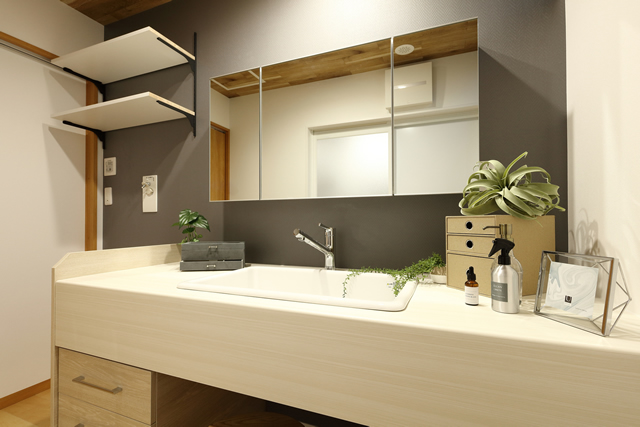 三面鏡タイプの洗面化粧台なら、横顔もしっかり確認できて、メイクの仕上がりが格段にアップ。LED照明で顔色も自然に見え、朝の身支度が楽しい時間に変わります。